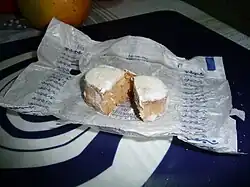 A polvorón (From polvo, the Spanish word for powder, or dust) is a type of heavy, soft, and very crumbly Spanish shortbread made of flour, sugar, milk, and nuts (especially almonds). They are mostly produced in Andalusia, where there are about 70 factories that are part of a syndicate that produces polvorones and mantecados.[1] Under the name mantecados, these sweets are a traditional preparation of other areas of the Iberian Peninsula and other Spanish-speaking countries as well.[2]