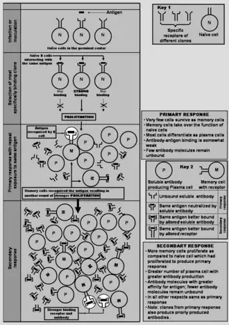 A naive (or inexperienced) B cell is one which belongs to a clone which has never encountered the epitope to which it is specific. In contrast, a memory B cell is one which derives from an activated naive or memory B cell. The activation of a naive or a memory B cell is followed by a manifold proliferation of that particular B cell, most of the progeny of which terminally differentiate into plasma B cells;[note 8] the rest survive as memory B cells. So, when the naive cells belonging to a particular clone encounter their specific antigen to give rise to the plasma cells, and also leave a few memory cells, this is known as the primary immune response. In the course of proliferation of this clone, the B cell receptor genes can undergo frequent (one in every two cell divisions)[8] mutations in the genes coding for paratopes of antibodies. These frequent mutations are termed somatic hypermutation. Each such mutation alters the epitope-binding ability of the paratope slightly, creating new clones of B cells in the process. Some of the newly created paratopes bind more strongly to the same epitope (leading to the selection of the clones possessing them), which is known as affinity maturation.[note 9][8][21] Other paratopes bind better to epitopes that are slightly different from the original epitope that had stimulated proliferation. Variations in the epitope structure are also usually produced by mutations in the genes of pathogen coding for their antigen. Somatic hypermutation, thus, makes the B cell receptors and the soluble antibodies in subsequent encounters with antigens, more inclusive in their antigen recognition potential of altered epitopes, apart from bestowing greater specificity for the antigen that induced proliferation in the first place. When the memory cells get stimulated by the antigen to produce plasma cells (just like in the clone's primary response), and leave even more memory cells in the process, this is known as a secondary immune response,[21] which translates into greater numbers of plasma cells and faster rate of antibody production lasting for longer periods. The memory B cells produced as a part of secondary response recognize the corresponding antigen faster and bind more strongly with it (i.e., greater affinity of binding) owing to affinity maturation. The soluble antibodies produced by the clone show a similar enhancement in antigen binding.[21]