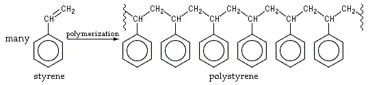 Common synthetic polymers have main chains composed of carbon, i.e. C-C-C-C.... Examples include polyolefins such as polyethylene ((CH2CH2)n) and many substituted derivative ((CH2CH(R))n) such as polystyrene (R = C6H5), polypropylene (R = CH3), and acrylates (R = CO2R').