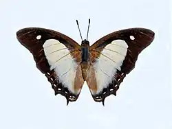 Polyura hebe has a wingspan of about 65 millimetres (2.6 in). In these medium-sized, heavy-bodies butterflies the outer edge of the forewings is concave, with a pointed apex and the hindwings show two short tails. The upperside of the wings is greenish white. A broad dark brown apical border, wide at the apex, but decreasing in width towards the base of the costa, forms a wide internal greenish-white band. Also the hindwings show a broad dark brown border, with submarginal small white marks. The underside is brown and has a wide pale silvery-green median patch. The caterpillar is bright green and has a black four-horned head.[2][3] Seitz - A species with many forms, inhabiting the whole of Macromalayana and parts of Micromalayana. hebe is especially beneath easily distinguishable from moori by the greenish median band being very much narrowed especially on the hindwings. The upper surface is characterized by the uniform black marginal zone of the hindwings, being never interrupted by yellow or greenish median marginal decorations as in moori.— [4] Seitz op. cit. gives an account of the numerous forms.