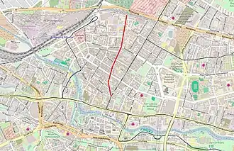 In 1867, with a new territory extension of the city, the whole street was comprised within the municipal area.[3] Its northern tip "Verlängerte Rinkauerstraße" (Extended Rinkauer street) was the location of Prussian army barracks, German: Kaserne Rinkau:[4] the Infanterie-Regiment Nr. 148 was part of the 41st Division in the pre-World War I organization.