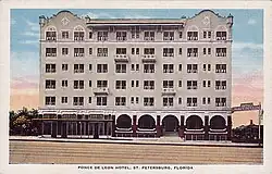 The Ponce De Leon is a Mission style hotel constructed in 1922 during the beginning of the Florida Land Boom, a period which saw St. Petersburg develop into a major resort city. It was the first major hotel in St. Petersburg to be situated along the waterfront and represents the transition from small scale, mainly frame boarding houses and hotels built before the World War I era to the large, masonry hotels built in the boom years of 1921–26. Hotels built in St. Petersburg before 1920 were small, usually less than 50 rooms, and entirely financed by their owner-operators. The first hotels built after the war in St. Petersburg, the Alexander in 1919 and the Cordova in 1921, show a change to masonry construction and architectural sophistication, but remained small in size. This shift in hotel type was a reflection of the growing wealth of the American economy in this period and the increased popularity of Florida as a winter tourist destination.