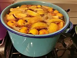 The traditional ingredients are tejocotes, pilloncillo (raw sugar cane), and cinnamon. The fruits of guava, tamarind, raisins, prunes, and oranges are common additions.[4] Ponche Navideño is served hot or warm,[3][6] and may be garnished with a stick of sugar cane.[4][7] When a shot of alcohol (popularly rum) is added to the punch, it is called ponche con piqueto ("punch with a sting").[1][2][8]
