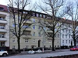 In 1950, a monument of Gratitude to the Soviet Army in the form of an obelisk topped with a five-pointed star was erected at the avenue's exit to Żołnierza Polskiego Square. The new city authorities decided to include part of the avenue in the project of the Śródmiejska Residential District, modeled on Warsaw's Marszałkowska Residential District.[17] A team of architects consisting of Henryk Nardy, W. Adamczyk, and Emanuel Maciejewski designed two five-story socialist-realist residential units with pitched roofs between 1952 and 1954. These units were intended to replace the war-damaged tenements on the section from Grunwaldzki Square to Lotników Square.[5][18] Construction was completed in 1958.[18] These were the first residential buildings constructed in the city after the end of World War II.[17]