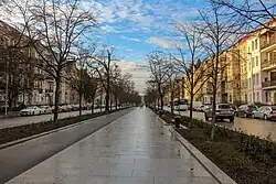 In 1882, the course of the street was modified by shortening it and finally determining its width.[5] The section south of Grunwaldzki Square (then Wilhelm-Platz) was designated at a width of 48 m – the street included 4 m wide pedestrian sidewalks, two 10 m wide roadways, and a central path for horseback riding. The ground floors of tenements built along this section were intended for shops and services. The section north of the square was designated in a 59 m wide corridor, with front gardens along its edges in front of the tenements serving almost exclusively residential functions (shops and cafes were planned only in corner buildings).[6]