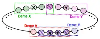 A commonly used structure for arranging the individuals of a population is a 2D toroidal grid,[17][1][2][15] although the number of dimensions can be easily extended (to 3D) or reduced (to 1D, e.g. a ring,[6][15] see the figure on the right). The neighbourhood of a particular individual in the grid is defined in terms of the Manhattan distance from it to others in the population. In the basic algorithm, all the neighbourhoods have the same size and identical shapes. The two most commonly used neighbourhoods for two-dimensional cEAs are L5 and C9, see the figure on the left. Here, L stands for Linear while C stands for Compact. Each deme represents a panmictic subpopulation within which mate selection and the acceptance of offspring takes place by replacing the parent. The rules for the acceptance of offspring are local in nature and based on the neighbourhood: for example, it can be specified that the best offspring must be better than the parent being replaced or, less strictly, only better than the worst individual in the deme.[2][6] The first rule is elitist and creates a higher selective pressure than the second non-elitist rule. In elitist EAs, the best individual of a population always survives. In this respect, they deviate from the biological model.