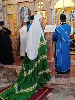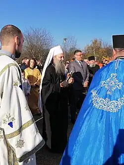Porfirije was enthroned on 19 February 2021 in St. Michael's Cathedral in Belgrade.[47] Patriarchal insignias were handed over to him by Metropolitan Hrizostom of Dabar-Bosnia and Bishop Lukijan of Buda. In his introductory speech Porfirije focused on unity and peace building. He stated that Kosovo and Metohija is in his prayers, and the Serbs in the affected Kosovo and Metohija will be in his first place.[48] Also, he stated that Croatia has become his second homeland, and the people he met there will remain a role model for him in the years to come.[49] The inauguration was attended by numerous government ministers of Serbia, representatives of churches and religious communities in Serbia, and various politicians including Serbian President Aleksandar Vučić. The ceremony was also attended by Milorad Dodik, the chairman and the presiding Serb member of the Presidency of Bosnia and Herzegovina; Željka Cvijanović, the President of Republika Srpska (Serb-majority entity of Bosnia and Herzegovina); Apostolic Nuncio Luciano Suriani; Archbishop Stanislav Hočevar, the Catholic archbishop of Belgrade, Effendi Mustafa Jusufspahić, the Mufti of Serbia; and many other dignitaries such as Prince Filip Karađorđević, a member of the House of Karađorđević.[50][47] On 20 February, a day following the inauguration, a Holy Synod member and one of the three prime candidates for the new Patriarch election Bishop Irinej of Bačka tested positive for COVID-19.[51]