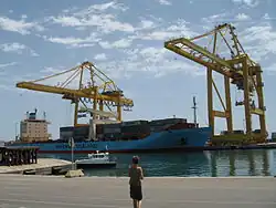 It is the largest port in Spain with almost 100 million tons in 2015[3] and second largest in the Mediterranean Sea,[4] and in 2018 was the 31st in the world in container shipping,[5] and 33rd overall in 2019.[6] In 2010 it exceeded 70 million tons in total traffic and more than 2.8 million containers.[7] The port totals over 10 km of quays in different basins, which manage all types of passenger and freight traffic.
