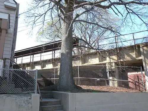 The station was opened by the Baltimore and Ohio Railroad on February 23, 1886, as a wooden surface station, with two high-level side platforms.[5][6] Between Port Richmond and West Brighton, the line crossed an eight-foot high suspension bridge over Bodine Creek. The low clearance of the bridge attracted some individuals to fish and crab from the trestle, leading to several accidents.[7][8] Beginning in 1935, the Port Richmond station and Tower Hill one stop west were elevated onto a concrete viaduct structure known as the Port Richmond Viaduct as part of the grade-crossing elimination project of the SIRT. The new trestle was built on top of the old Bodine Creek bridge, raising the crossing to safer heights. At the time, the one-mile viaduct was claimed to be "the longest in the United States." The new station was opened on February 26, 1937.[5][6][9][10] East of the station, the line returns to grade level after crossing the remnants of Bodine Creek, with the trestle ending at the east end of the Port Richmond Water Pollution Control Plant operated by the NYCDEP.[1][6][11] The station was closed on March 31, 1953, along with the rest of the North Shore Branch and the South Beach Branch.[5] Port Richmond is one of the few stations along the North Shore line standing today, as of June 2013.[1]