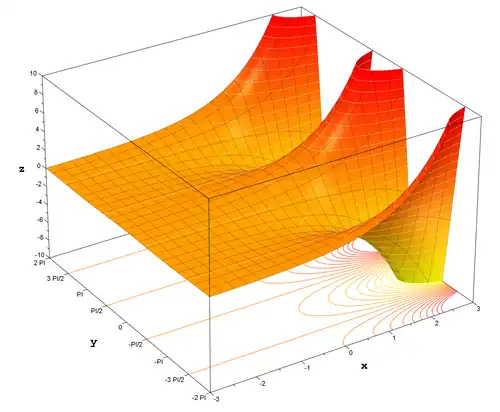 The exponential function exists for any complex number. Plotted above are the real part (left) and the imaginary part (right) of various values of the exponential function in the complex plane. |
