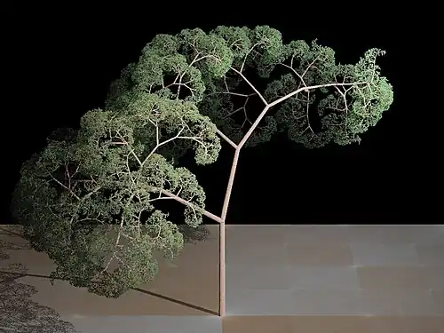 The Pythagoras tree is a plane fractal constructed from squares. It is named after Pythagoras because each triple of touching squares encloses a right triangle, in a configuration traditionally used to depict the Pythagorean theorem. This one has been specially coloured to give a more tree like and more 3 dimensional appearance. | Pythagoras tree | |