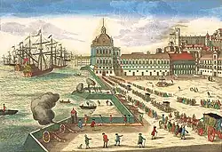 In 1542, Portuguese traders arrived in Japan. According to Fernão Mendes Pinto, who claimed to have been present in this first contact, they arrived at Tanegashima, where locals were impressed by firearms that would be immediately made by the Japanese on a large scale.[37] The arrival of the Portuguese in Japan in 1543 initiated the Nanban trade period, with the hosts adopting several technologies and cultural practices, such as the arquebus, European-style cuirasses, European ships, Christianity, decorative art, and language. In 1570, after an agreement between Jesuits and a local daimyō, the Portuguese were granted a Japanese port where they founded the city of Nagasaki,[38] thus creating a trading center which for many years was Japan's main gateway to the world.