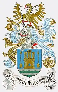 This restriction would become irrelevant when King Manuel I forbade the use of arms to those who were not of the Portuguese nobility.[5] This restriction against burgher arms in Portugal lasted until the end of the Monarchy in 1910, although, by that time, it was very common to a burgher who stood out in politics, commerce, industry, agriculture, military or other matters, to be ennobled and so to become entitled to bear a coat of arms.