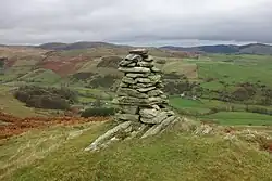 Potter Fell is made up of four separate peaks (as identified by Wainwright), two of which are unnamed. The first unnamed summit (395 m / 1,296 ft)[3] lies between Potter Tarn and Brunt Knott.[4] Further north from the first unnamed summit is Brunt Knott (427 m / 1,401 ft),[5] marked by a stone triangulation station at its highest point.[6] Between these first two summits is a small pool of water with a wall running through it, which Wainwright named "wall through a pool".[6] East of these two summits is another unnamed one (390 m / 1,280 ft).[7][4] Further east is the fourth summit, Ulgraves (332 m / 1,089 ft);[8][9] like Brunt Knott, the highest point is marked by a trig point. The summit of Ulgraves looks over the Longsleddale valley.[10]