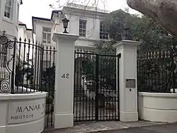 Manar, in Macleay Street, is a complex of three blocks of flats which dates back from the original house c.1880 through to the Inter-war Free Classical style buildings of the 1920s. They are two to three stories in height with cement rendered masonry walls and terracotta tiles roofs. The 1920s wings were designed by the architectural practice of Ernest A Scott and Green (1911–1932), later known as Scott Green and Scott (1932–1947). Residents of Manar have included William Parker who served as Master in Lunacy in the Supreme Court of New South Wales,[9] Sir Mungo William MacCallum, Sydney Ure Smith, Sir Garfield Barwick, Senator John Ignatius Armstrong, Mary McEwen, widow of Sir John McEwen, and Mary Bailey-Tart, the only daughter of Sir Earle Page[10]