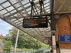 The station has a ticket office, at street level, which is staffed throughout the week (Monday to Saturday 06:10 to 19:30 and Sunday 06:40 to 18:10). There is also a self-service ticket machine provided for use outside these times and for collecting pre-paid tickets. There is a waiting room at platform level, along with toilets, bench seating and timetable posters. Train running information is offered via automatic announcements and digital display screens. Step-free access is available via lifts from the entrance to the platform when the ticket office is staffed.[8]