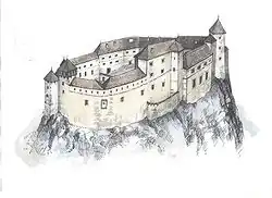 The first settlement of the castle cliff is dated to Púchov culture, also a Celtic coin was found on the hill. The exact year of establishment of the Bistrizza castle is not known, but it is assumed that it might have been around 1128 AD. There are doubts that the castle in those times might have been made of wood because of the presence of two other wooden castles in present-day Slovakia. For the shift from wooden castle is probably responsible Béla IV, after the invasions of Batu Khan. However, the first written reference is from 1316, closely connected to Matthew III Csák. The next holder of the castle was county judge Alexander Köcski. Together with his son Miklós, they ruled from 1325 to 1354. From 1354 the castle belonged to Pál Ugali, chancellor of ex-county judge. During last few years of the 14th century, King Sigismund gave the fortress to palatine Sudivoj, but the owner was quickly changed, and from 1400 to 1425 it belonged to Stibor of Stiboricz. Then it became the possession of a king. In 1458 Matthias Corvinus of Hungary donated the castle, the town and 16 surrounding villages to László Podmanitzky of the Podmanitzky for his devotion to him, preceded by violent death of his father Antal Podmanitzky in the service of the king. His diligent work for the ruler prepared a good position for his sons and great upsurge of his possession.