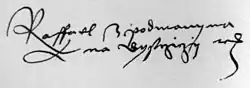 In the grave of Rafael a silver club was discovered from which a chalice was made. This was (in 1901) still in possession of the church. The chalice has the following inscription: "ARCUM SZUCSA SOLIS AEQUARI CURAVIT FERDINANDUS L 1528". The marble monument of Rafael Podmanitzky in Považská Bystrica is of interest because it has an inscription all around in old Slovak language it says "LETA PANIE TISICEHO PIETISTEHO PADESATEHO OSMEHO PRWNI STRZEDU W PUSTIE UMRZEL GEST UROZENY PAN RAFFAEL PODMANITZKY Z PODMANINA JEHOZ DUSSY PAN BUOH MILOSTIW RACZ BIETI". The monument is on the right side wall of the Roman Catholic Church not far from the "Galerie". It depicts a very tall man in full armor. The facial features are clearly chiseled in the stone.