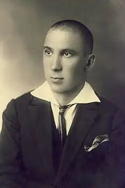 Skardčius was born in Subačius to a family of Lithuanian peasants who owned 21.5 hectares (53 acres) of land.[3] He attended a primary school in Subačius and then a four-year school in Panevėžys. Due to World War I, he dropped out of school but continued self-education at home. In January 1920, he passed entrance examinations to the 5th grade at Panevėžys Gymnasium. He graduated from the gymnasium in June 1923 with a gold medal.[3] His teachers included Gabrielė Petkevičaitė-Bitė and Julijonas Lindė-Dobilas. He was an active student and helped organizing an art club.[4]