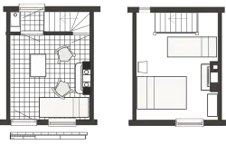 Some two-room cottages were as small as 10 feet (3.0 m) by 10 feet (3.0 m). Their narrow steep stairs aligned with the side or back wall. The heating was an open coal-fired cast-iron cooking range in the living room, and maybe a cast-iron 'register grate'[a] in the bedroom.[10]