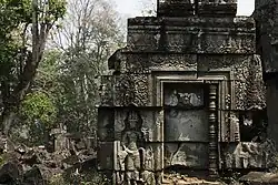 Many famous Khmer sculptures come from here, such as the putative head of Jayavarman VII that is displayed at the National Museum of Cambodia. The sculptures and carvings of Preah Khan are among the peak works of Khmer art, and the temples have been widely sacked in the past. Thieves have also damaged many structures while looting sculptures and carvings during the second half of the 1990s.[7]