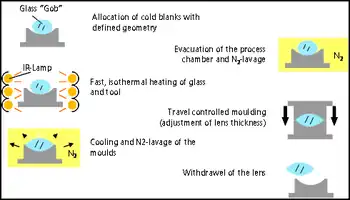 - Precision glass moulding: In this step the preform is directly formed into an optical glass lens. It is necessary to clean the glass preform and the mould before starting the process, but there is no polishing or post-machining required.