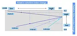 - The glass exhibits a change in refractive index, called index drop, during the annealing process. This drop is caused by fast cooling of the mould insert, inducing a small amount of residual stress in the glass. As a result, the glass exhibits a small index change when compared to its fine anneal state. The index drop is small (usually .002-.006), but the optical design needs to be optimized to compensate for this change. As an example, the index drop for different glass types is displayed in the picture on the right for different annealing rates. Note that the annealing rate is not necessarily constant during the cooling process. Typical “average” annealing rates for precision molding are between 1000 K/h and 10,000 K/h (or higher). Not only the refractive index, but also the Abbe-number of the glass is changed due to fast annealing. The shown points in the picture on the right indicate an annealing rate of 3500k/h.