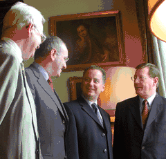 Following his nomination, the First Minister-elect visited London to meet the British Prime Minister, Tony Blair. Then after, McConnell attended Buckingham Palace, where he was issued the Royal Warrant of Appointment by Her Majesty the Queen.[21][22] On 27 November 2001, McConnell was officially sworn into office as First Minister of Scotland at the Court of Session in Edinburgh.[23]