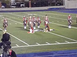 Once the drummers and commanders retire to their previous positions (in the band and the regiment respectively), the new colours are then marched to their position in a formation to the tune of the regimental march[6] or the national anthem of the country in slow march. This will signal the start of the regimental march past for the reviewing officer who stands on a makeshift saluting base (or dais). While marching in a slow march, the new colours will be lowered (flourished) to the ground to show respect to the reviewing officer, if in a quick march, they are not.[12]