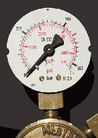 A pressure gauge reading in psi (red scale) and kPa (black scale)