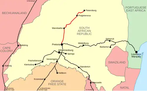 Construction started in 1897 and on 1 July 1898, the first 132 km between Pretoria and Nylstroom was opened. Three months later, the next 90 km between Nylstroom and Potgietersrus was opened and on 31 May 1899, the last 63 km between Potgietersrus and Pietersburg was opened. The railway begins at Pretoria Station, where it connects to the NZASM railway network. It passes the city to the west and follows the Apies River to Hammanskraal. As the Apies River and Pienaars River turn west, the railway continues northwards to Warmbad, where it ascends to Nylstroom. It then turns northeast and follows the Nyl River to Potgietersrus. From there, it crosses the Waterberg and descends to Pietersburg.[1]