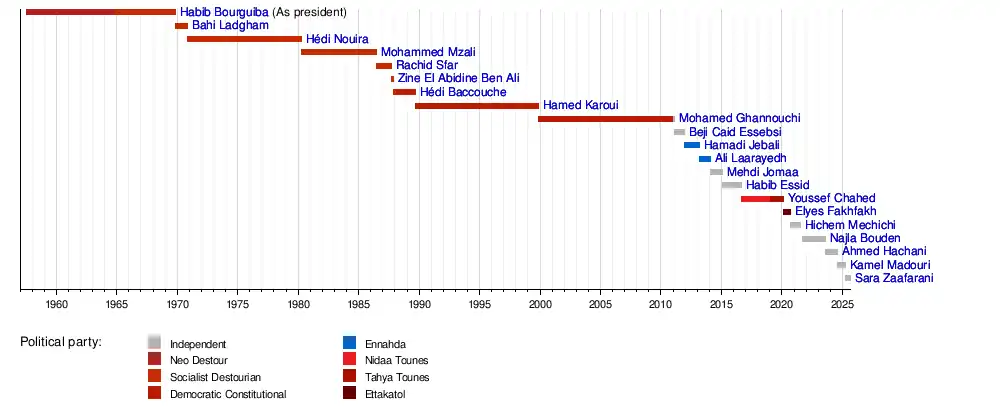 Three prime ministers became presidents afterwards: Habib Bourguiba, Zine El Abidine Ben Ali, and Beji Caid Essebsi.
