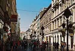 Knez Mihailova Street (Serbian: Кнез Михаилова улица, romanized: Knez Mihailova ulica, officially: Улица кнеза Михаила, Ulica kneza Mihaila) is the main pedestrian and shopping zone in Belgrade, and is protected by law as one of the oldest and most valuable landmarks of the city. Named after Mihailo Obrenović III, Prince of Serbia, it features a number of buildings and mansions built during the late 1870s.