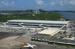 Princess Juliana International Airport (IATA: SXM, ICAO: TNCM) is the main airport on the Caribbean island of Saint Martin. The airport is located on the Dutch side of the island, in the country of Sint Maarten, close to the shore of Simpson Bay Lagoon. In 2015, the airport handled 1,829,543 passengers and around 60,000 aircraft movements.[2] The airport serves as a hub for Winair and is the major gateway for the smaller Leeward Islands, including Anguilla, Saba, Saint Barthélemy and Sint Eustatius. It is named after Queen Juliana of the Netherlands, who landed there while she was heir presumptive in 1944, the year after the airport opened. The airport has very low-altitude flyover landing approaches because one end of its runway is extremely close to the shore and Maho Beach. While Princess Juliana International is the primary aviation gateway to the island, there is also a smaller public-use airport on the French side, in the French Collectivity of Saint Martin, called Grand Case-Espérance Airport.