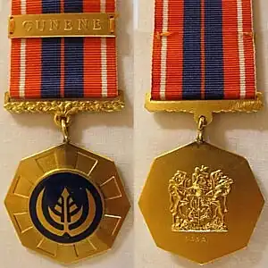 Only the Cunene clasp was awarded, to members who served in Angola during Operation Savannah in 1975 and 1976. Recipients of the clasp wear a button, with the letter C encircled by a wreath, on the ribbon bar.[1][5][10]