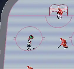 An additional level of sponsorship from the National Hockey League Players' Association gave it an additional touch of legitimacy. There is also a practice and regular season mode on the Super Nintendo Entertainment System version of the game.[3] All the offensive and defensive plays are done as realistic as possible. Major and minor penalties are called in addition to offside and icing. Game misconducts can be called at random by the referee; not even players with low levels of aggression like Wayne Gretzky and Eric Lindros can escape a game misconduct penalty.[4] Regular season and exhibition games can end in a tie, bringing up the same end of game screen as if the player's team lost.[5]