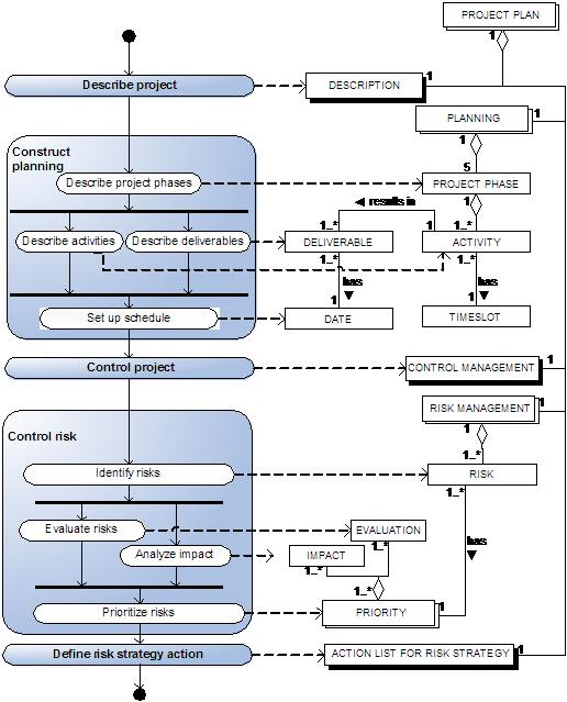 Activity Sub-Activity Description Describe Project Describing the project is done in terms of participants, targets, products, scope and assumptions. This information is derived from the proposal, but with more emphasis on the project management issues. The activity end in a project DESCRIPTION. Construct planning Describe project phases The PLANNING is divided into five PROJECT PHASES, which should be shortly described. Construct planning Describe activities The project ACTIVITIES are described and grouped into PROJECT PHASES. Construct planning Describe deliverables The DELIVERABLES that result from the project ACTIVITIES are described. Construct planning Set up schedule For every DELIVERABLE a DATE is set and for each ACTIVITY a TIME SLOT is estimated. Control project Controlling the project results in a CONTROL MANAGEMENT artifact. This artifact is not further explained here, since it concerns regular project management issues, like communication management, progress management, change management and problem management that lie outside the scope of this research. Control risk Identify risks Identifying risks can be done by using standard checklists or organizing risk workshops. The RISKS are included in the PROJECT PLAN. Control risk Evaluate risks Every RISK is provided with an EVALUATION; a description and estimation about the complexity or uncertainty of a project is given. Control risk Analyze impact Analyzing the impact of a risk handles about the IMPACT, a risk has on the success of a project. The evaluation and risk values are indicated by selecting a value: low, moderate or high. Control risk Prioritize risks Prioritizing the risks is done by combining IMPACT and EVALUATION in a table. High priority is then given to RISKS with the highest scores. Define actions for risk strategy Risk strategy actions can be obtained from experience or from relevant literature. The project manager adapts the actions to the project in the ACTION LIST FOR RISK STRATEGY. RISKS with the highest priority are on top of the list and need to be handled first.