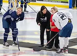 The PWHPA formed an early advisory partnership with American tennis legend Billie Jean King, an early advocate for women's equality in sports and the founder of the Women's Tennis Association.[34] In December 2019, the PWHPA partnered with the ECHL and chose four members to participate in the 2020 ECHL All-Star Game, with Dani Cameranesi, Kali Flanagan, Gigi Marvin, and Annie Pankowski each assigned to one of the four teams.[35] The 2020 NHL All-Star Game also expanded its inclusion of female skaters from previous seasons to a full three-on-three exhibition game between teams composed of American and Canadian women's players.[36] Eighteen of the 20 players were active PWHPA members and the event was supported by the PWHPA, but it was not directly in partnership with the association.[37][38] In March 2020, the PWHPA partnered with the Arizona Coyotes for their sixth Dream Gap tour stop in Tempe, Arizona.[39] The New York Rangers became the first NHL team to host a PWHPA game on February 28, 2021, at Madison Square Garden.[40] The PWHPA announced it would also be partnering with the Toronto Maple Leafs with the team hosting a game and providing marketing assistance and sponsorship consultation services.[41]