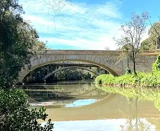 On January 1, 1806, two grants were made to James Gowan, one of them being on the northern bank of the creek. On January 1810, settlers Thomas Hanson and James Larra also received land grants just north of the creek, proximate to the Carramar railway station.[14] In 1820s, Joseph Kenyon's Woodlands on the eastern bank of Prospect Creek were described as having "immaculate lawns", "ornamental gardens" and a "showplace of the district".[8] In 1832 Surveyor-General Thomas Mitchell commissioned David Lennox for a sum of £1,083 ($2,166)[15] to build Lansdowne Bridge "at the intersection of Prospect Creek and Southern Street"; it was completed in 1836.[16]