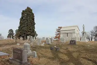 Many of Omaha's early business leaders and politicians are buried in the cemetery.[5] There were approximately 15,000 burials recorded at Prospect Hill, including those of many Omaha pioneers, including influential developers, religious leaders, mayors, judges, and benefactors, for whom Omaha streets, parks and schools were named.[6] The cemetery has many interesting monuments and a special section for soldiers from Fort Omaha, and it also has graves for at least 360 early African American Omahans.[7]