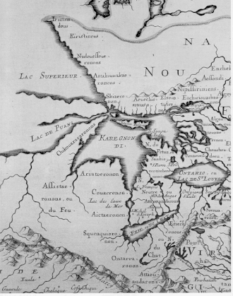 The Neutral Nation formed a league of eight hundred Upper Algonquians in 1653.[91] This league was located southwest of Skenchioe, near a Fox village in the Flat Country of The Thumb, Michigan. The Cat Nation Neighbored the Upper Algonquians to the east and scattered around the southern shore of Lake Erie.[92][93] From the other direction, kindred Kentaientonga villages were destroyed by Iroquois as they told to the French years afterward.[94] At Le Chine in 1669 at Montreal Island,[95] La Salle was told to expect to find Chaouanon (Algonquian) and Honniasontkeronon (Iroquois) villages on the Ohio above the falls or above Louisville, Kentucky.[96] Exploration information was seldom shared between different European nations. The Andasté (Chiroenhaka) found on maps as Calicuas territory impeded the New York Haudenosaunee and the French Canadien trade in this region at the time.[97]