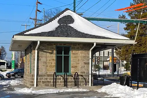 Providence Road/Media station is the location where the D1 leaves State Street and enters a separate right of way. A storage track begins east of Providence Road across from the station shed that eventually becomes the second track.[1] Additionally, a shopping center exists along Baltimore Pike between North Providence and Beatty Roads, which has a stop of its own.