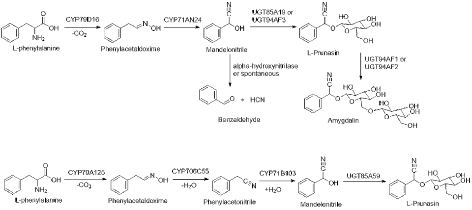 - ^ a b Yamaguchi, Takuya; Yamamoto, Kazunori; Asano, Yasuhisa (September 2014). "Identification and characterization of CYP79D16 and CYP71AN24 catalyzing the first and second steps in l-phenylalanine-derived cyanogenic glycoside biosynthesis in the Japanese apricot, Prunus mume Sieb. et Zucc". Plant Molecular Biology. 86 (1–2): 215–223. Bibcode:2014PMolB..86..215Y. doi:10.1007/s11103-014-0225-6. ISSN 0167-4412. PMID 25015725. S2CID 14884838.