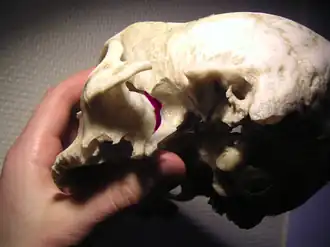 Human skull with entrance to pterygopalatine fossa marked in red | |