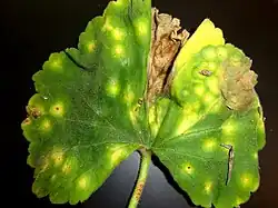 Symptoms of rust infection on the upper side of a geranium leaf | |