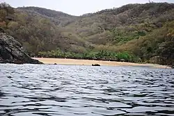 In addition to the two beaches in the bay proper, there are a number of small isolated coves with beaches just to the east of Puerto Ángel. These include Playa Ixtacahuite, Playa La Mina, Playa La Boquilla and Playa La Tijera.[2] Ixtacahuite Beach is best for scuba diving and recreational fishing because it is next to a coral reef.[3] La Boquilla Beach is on a small shallow bay and is best for snorkeling.[3] It can be reached by road with a rugged vehicle but is easier to arrive by boat from Puerto Ángel. There is a restaurant that's open during the high season seasons.[18]