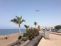 Since the opening of the Hotel los Fariones in 1967[5] it attracts tourists from all over Europe, particularly Ireland, the UK and Germany as well as from Scandinavia and Spain.[6] The Avenida de las Playas, the main street/avenue in the town, extends some 7 km along the island's southern coast, with beaches on one side and many restaurants, bars, shops and other tourist attractions on the other. Apartments, villas and hotels cover a kilometre or so inland from the coastline. The quaint and peaceful old town includes the harbour and docks, the Puerto Tinosa. Here there are a smaller variety of restaurants and bars with views across the harbour and the sea to the volcanic mountains of Papagayo beyond to views of another Canary Island: Fuerteventura.