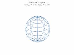 Animation of the increased spin of a pulsar as it collapses. It begins with (1) The rotating progenitor (2) The collapse and speedup and (3) The final fast spinning pulsar remnant. The animation demonstrates the conservation of momentum as the star spins faster as it collapses. The angular speed () and radius () relative to the progenitor are shown throughout the process. This does not capture the entire collapse scale as the final star would be too small to see compared to its progenitor.