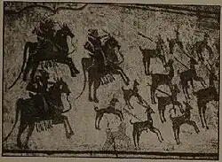 Murals (including frescoes) feature prominently in Punjab and showcase various themes.[14] Punjabi murals differ from Punjabi miniature paintings in that the wall paintings were far more readily accessible and viewable by the general masses rather than being mostly an affair restricted to the privileged classes of the society, as in the case of miniatures.[14] Since murals could be seen by all walks of society, the things depicted in them were commonly understood subjects that required no specialized knowledge.[14] Punjabi murals can depict religious or secular settings.[14]