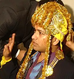 Jaggo translates "to wake up".[2] In this ceremony, the family dances and sings in the beautifully decorated wedding home. Jaggo is celebrated in the last hours of the night. They decorate copper or brass vessels called khadaa with diveh (clay lamps) and fill them with mustard oil and light them. The bride or bridegroom's maternal aunt (mami) carries it on her head, and another woman will carry a long stick with bells, shaking it. The women will then go into other friends' and families' homes; after being welcomed by sweets and drinks, they dance there and move on.[1] It is a loud ceremony, filled with joy, dancing, fireworks, and food. It is also practiced in Pakistan.